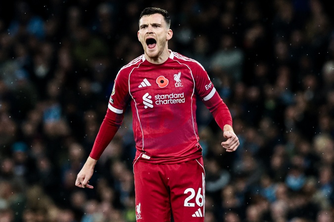 Andrew Robertson of Liverpool shouts instructions during the Premier League match Manchester City vs Liverpool at Etihad Stadium, Manchester, United Kingdom, 9th November 2025, Credit:Mark Cosgrove/News Images / Avalon