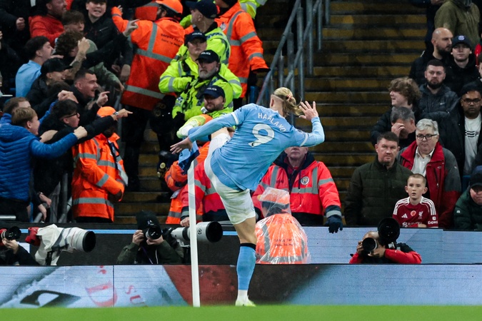 Erling Haaland of Manchester City celebrates goal to make it 1-0 during the Premier League match Manchester City vs Liverpool at Etihad Stadium, Manchester, United Kingdom, 9th November 2025, Credit:Mark Cosgrove/News Images / Avalon