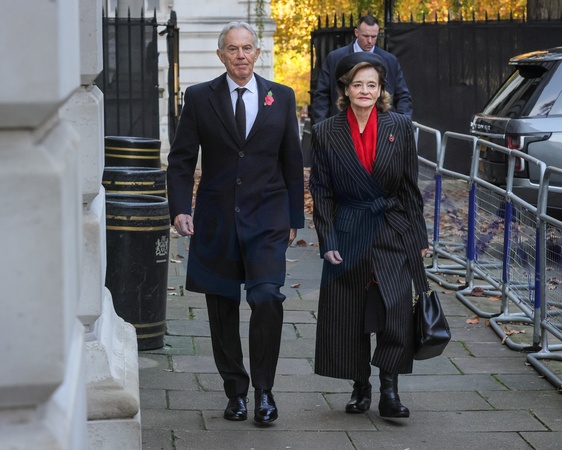 London, UK. 09th Nov, 2025. Sir Tony Blair, former Labour Prime Minister and wife Lady Cherie Blair. Politicians, including the PM, many former Prime Ministers and dignitaries, are seen walking through Downing Street on the way to and from attending the Remembrance Sunday ceremony on Whitehall in Westminster., Credit:Imageplotter / Avalon