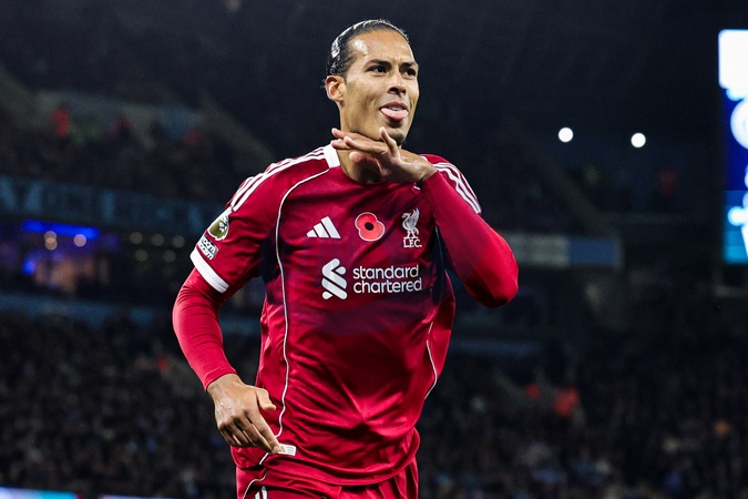 Virgil van Dijk of Liverpool celebrates goal but given offside during the Premier League match Manchester City vs Liverpool at Etihad Stadium, Manchester, United Kingdom, 9th November 2025, Credit:Mark Cosgrove/News Images / Avalon