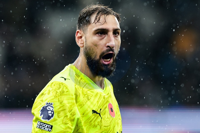 Gianluigi Donnarumma of Manchester City celebrates half time whistle 2-0 up during the Premier League match Manchester City vs Liverpool at Etihad Stadium, Manchester, United Kingdom, 9th November 2025, Credit:Mark Cosgrove/News Images / Avalon