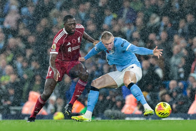 Ibrahima Konaté of Liverpool tackles Erling Haaland of Manchester City during the Premier League match Manchester City vs Liverpool at Etihad Stadium, Manchester, United Kingdom, 9th November 2025, Credit:Mark Cosgrove/News Images / Avalon