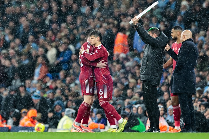 Andrew Robertson of Liverpool is substituted for Milos Kerkez of Liverpool during the Premier League match Manchester City vs Liverpool at Etihad Stadium, Manchester, United Kingdom, 9th November 2025, Credit:Mark Cosgrove/News Images / Avalon