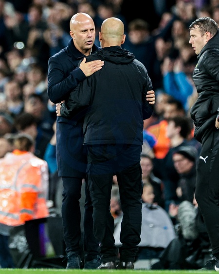 Pep Guardiola Manchester City manager and Arne Slot Liverpool manager embrace after 3-0 win after the Premier League match Manchester City vs Liverpool at Etihad Stadium, Manchester, United Kingdom, 9th November 2025, Credit:Mark Cosgrove/News Images / Avalon