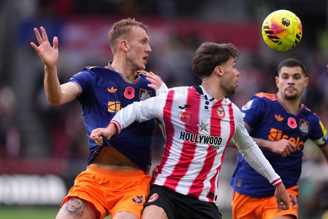 Dan Burn of Newcastle United and Aaron Hickey of Brentford during the Premier League match Brentford vs Newcastle United at The Gtech Community Stadium, London, United Kingdom, 9th November 2025, Credit:Harvey Murphy/News Images / Avalon