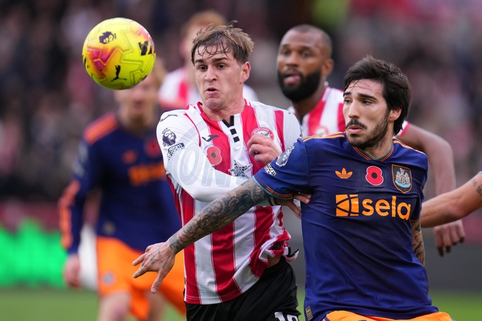 Sandro Tonali of Newcastle United and Yehor Yarmolyuk of Brentford battle during the Premier League match Brentford vs Newcastle United at The Gtech Community Stadium, London, United Kingdom, 9th November 2025, Credit:Harvey Murphy/News Images / Avalon