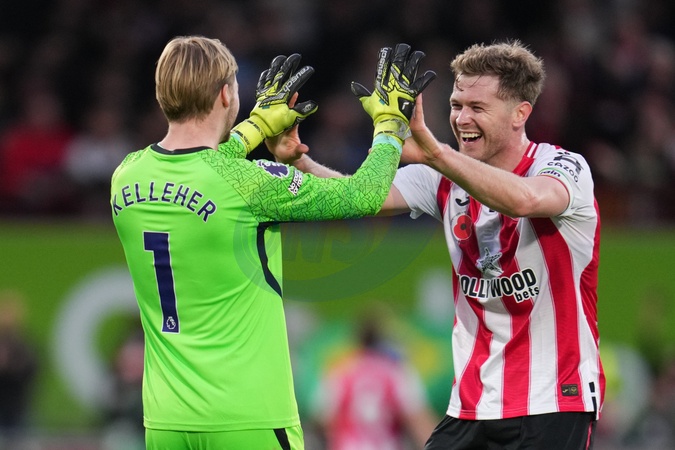 Caoimhín Kelleher of Brentford and Nathan Collins of Brentford during the Premier League match Brentford vs Newcastle United at The Gtech Community Stadium, London, United Kingdom, 9th November 2025, Credit:Harvey Murphy/News Images / Avalon