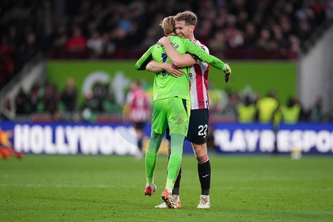 Caoimhín Kelleher of Brentford and Nathan Collins of Brentford celebrate win during the Premier League match Brentford vs Newcastle United at The Gtech Community Stadium, London, United Kingdom, 9th November 2025, Credit:Harvey Murphy/News Images / Avalon