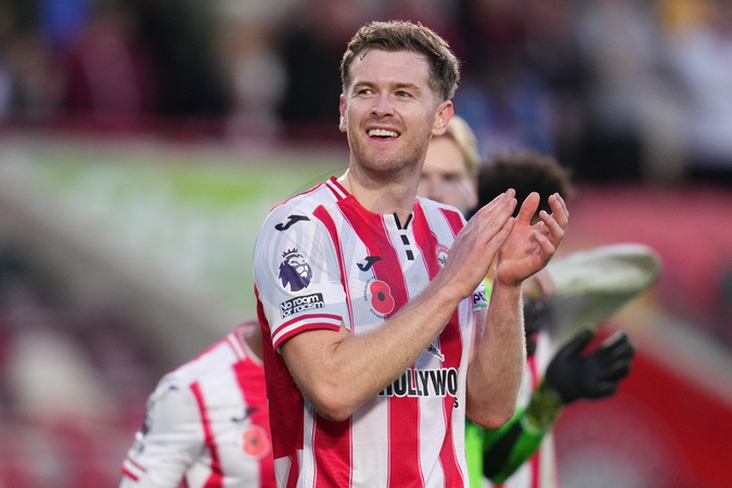 Nathan Collins of Brentford applauds home support during the Premier League match Brentford vs Newcastle United at The Gtech Community Stadium, London, United Kingdom, 9th November 2025, Credit:Harvey Murphy/News Images / Avalon