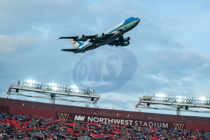 Air Force One, with President Donald Trump aboard, performs a flyover of Northwest Stadium in Landover, Maryland, Sunday, November 9, 2025., Credit:Daniel Torok / Avalon