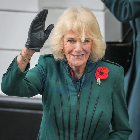 London, UK. 11th Nov, 2025. Her Majesty smiles and waves at members of the public. Queen Camilla arrives by Train into Paddington Station and joins 'Poppies for Paddington' the Commemorations on Armistice Day. 'Poppies to Paddington' is an annual commemoration. Poppy wreaths from around the GWR network are collected by designate trains, arriving into Paddington station before 1100, followed by a 2 minute silence and commemorative proceedings., Credit:Imageplotter / Avalon
