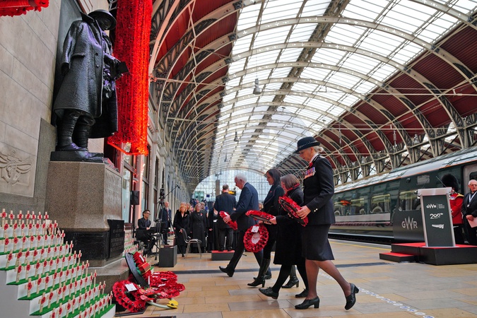 Wreaths are laid at London Paddington train station as part of the Great Western Railway 'Poppies to Paddington' event to mark Armistice Day. Picture date: Tuesday November 11, 2025., Credit:Ben Birchall / Avalon