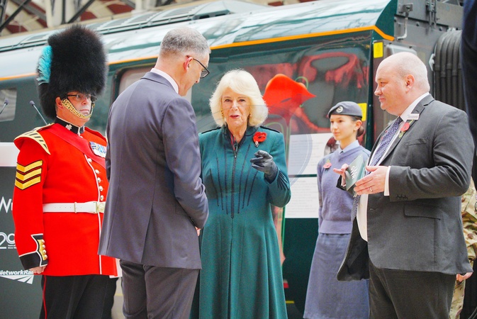 Queen Camilla at London Paddington train station as part of the Great Western Railway 'Poppies to Paddington' event to mark Armistice Day. Picture date: Tuesday November 11, 2025., Credit:Ben Birchall / Avalon