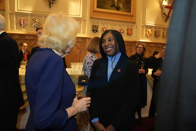 Queen Camilla and Conservative Party leader Kemi Badenoch at a reception for veterans who served in the Pacific during the Second World War, part of the commemorations marking the 80th anniversary of VJ Day, at Windsor Castle, Berkshire. Picture date: Tuesday November 11, 2025., Credit:Andrew Matthews / Avalon