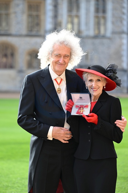 Lady Anita May, with her husband Sir Brian May. // Men and women from a wide variety of fields and occupations flock to Windsor Castle to be royally awarded., Credit:Tony Kershaw / Avalon