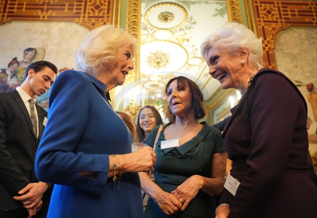 Queen Camilla, Patron of the English National Ballet, speaks with Arlene Phillips and Angela Rippon during a reception with staff, dancers, and supporters to celebrate the company's 75th anniversary and recognise the heritage, innovative creation of new works, and their learning and engagement programme, at Buckingham Palace in central London. Picture date: Wednesday November 12, 2025., Credit:Yui Mok / Avalon