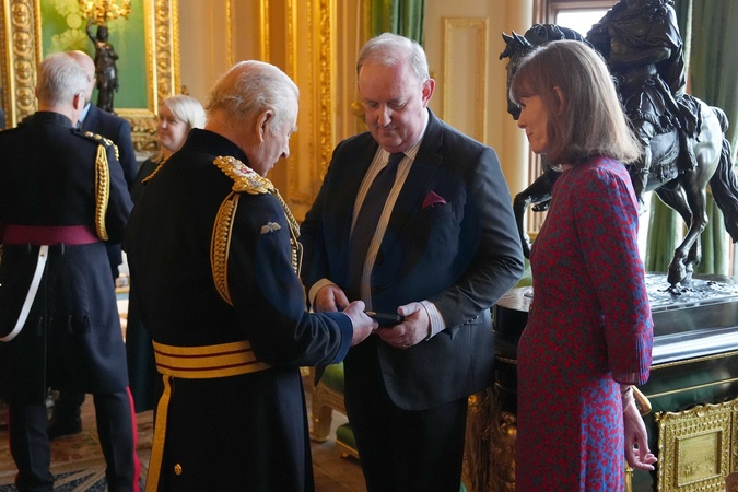 Mr. Andrew Murphy (Son) receives the Elizabeth Emblem from King Charles III at Windsor Castle, Berkshire, for Detective Inspector David Murphy, Royal Ulster Constabulary. Picture date: Wednesday November 12, 2025., Credit:Jonathan Brady / Avalon