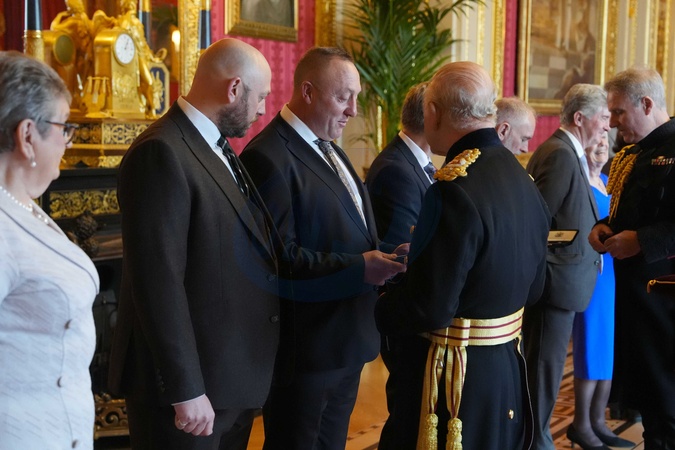Mr. Philip Martin (Son) receives the Elizabeth Emblem from King Charles III at Windsor Castle, Berkshire, for Constable Gary Martin, Royal Ulster Constabulary. Picture date: Wednesday November 12, 2025., Credit:Jonathan Brady / Avalon