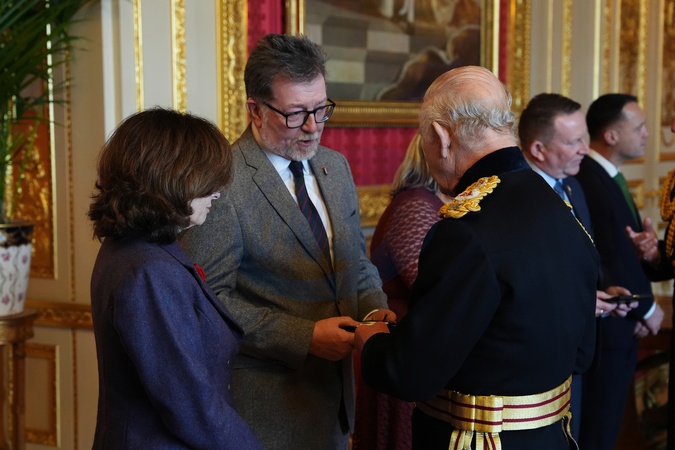 Mr. Kenneth Allen (Son) receives the Elizabeth Emblem from King Charles III at Windsor Castle, Berkshire, for Reserve Constable Wallace Allen, Royal Ulster Constabulary Picture date: Wednesday November 12, 2025., Credit:Jonathan Brady / Avalon