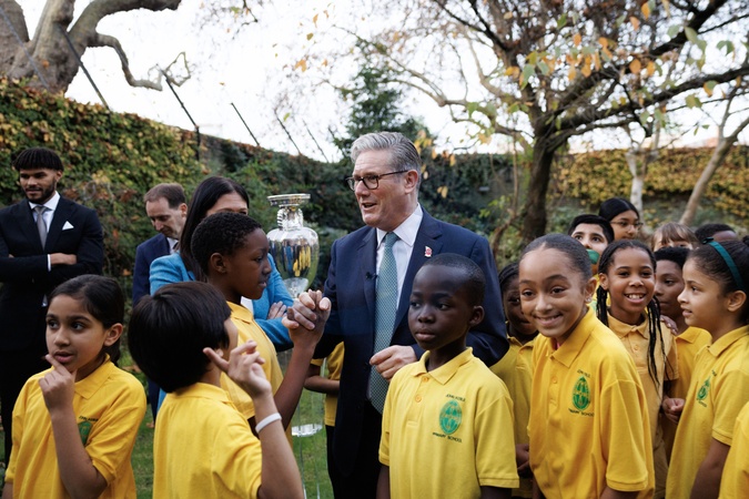 12/11/2025. London, United Kingdom. Prime Minister Keir Starmer, Lisa Nandy Secretary of State for Media, Sport and Culture, Aleksander Čeferin, UEFA President and Premier League footballer Tyrone Mings meets school children in the garden of 10 Downing Street on the launch of Euro 2028 mens football tournament which will be hosted in the United Kingdom., Credit:Simon Dawson / Avalon