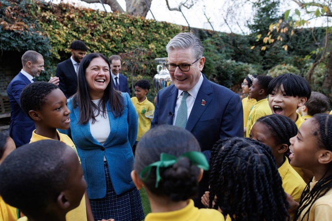 12/11/2025. London, United Kingdom. Prime Minister Keir Starmer, Lisa Nandy Secretary of State for Media, Sport and Culture, Aleksander Čeferin, UEFA President and Premier League footballer Tyrone Mings meets school children in the garden of 10 Downing Street on the launch of Euro 2028 mens football tournament which will be hosted in the United Kingdom., Credit:Simon Dawson / Avalon