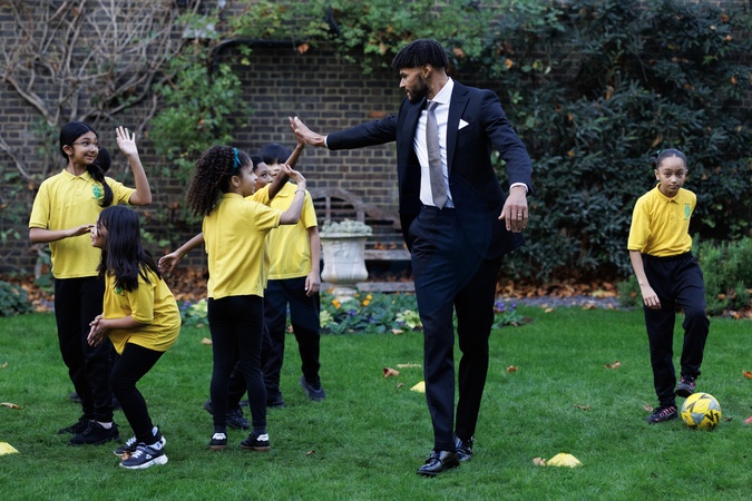 12/11/2025. London, United Kingdom. Prime Minister Keir Starmer, Lisa Nandy Secretary of State for Media, Sport and Culture, Aleksander Čeferin, UEFA President and Premier League footballer Tyrone Mings meets school children in the garden of 10 Downing Street on the launch of Euro 2028 mens football tournament which will be hosted in the United Kingdom., Credit:Simon Dawson / Avalon