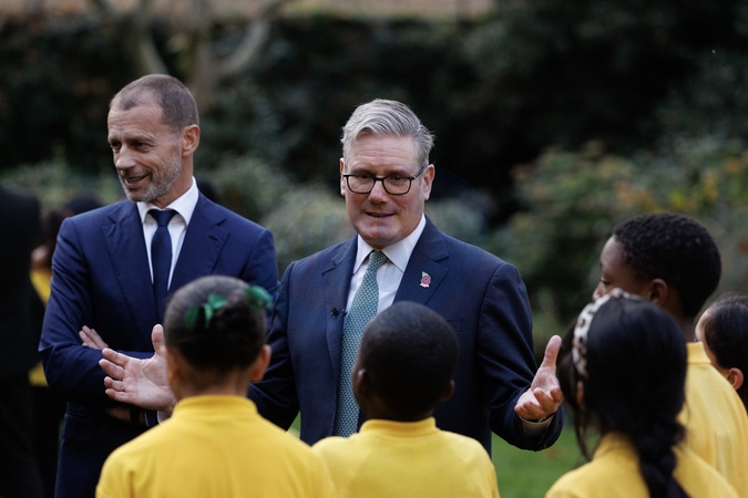 12/11/2025. London, United Kingdom. Prime Minister Keir Starmer, Lisa Nandy Secretary of State for Media, Sport and Culture, Aleksander Čeferin, UEFA President and Premier League footballer Tyrone Mings meets school children in the garden of 10 Downing Street on the launch of Euro 2028 mens football tournament which will be hosted in the United Kingdom., Credit:Simon Dawson / Avalon