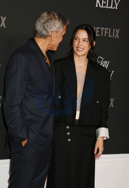 LOS ANGELES, CALIFORNIA - NOVEMBER 11: (L-R) George Clooney and Riley Keough at the Los Angeles premiere of Netflix's "Jay Kelly" at The Egyptian Theatre Hollywood on November 11, 2025 in Los Angeles, California., Credit:Jeffrey Mayer / Avalon