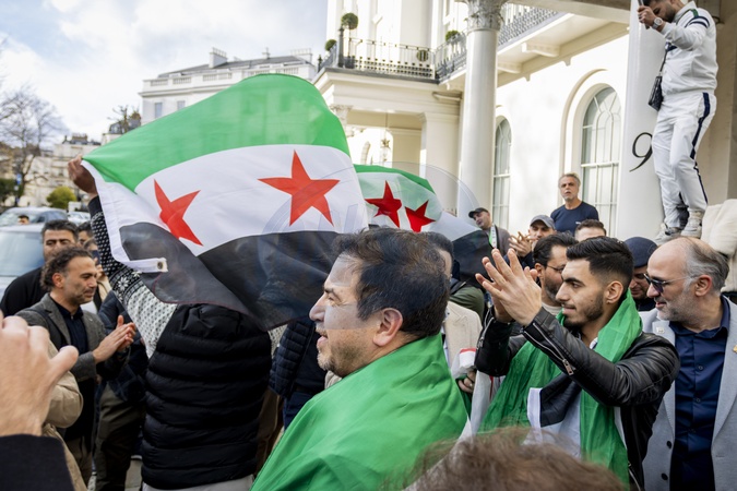 Syrian Foreign Minister Asaad al-Shaibani made his first official visit to the United Kingdom, marking the reopening of the Syrian Embassy in London after its closure in 2011. The visit included a flag-raising ceremony led by the foreign minister, symbolising the restoration of diplomatic presence and renewed ties between Syria and the UK., Credit:Zak Irfan / Avalon