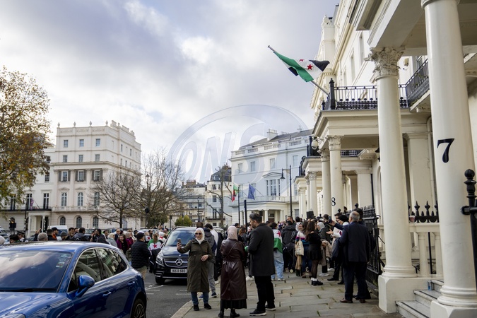 Syrian Foreign Minister Asaad al-Shaibani made his first official visit to the United Kingdom, marking the reopening of the Syrian Embassy in London after its closure in 2011. The visit included a flag-raising ceremony led by the foreign minister, symbolising the restoration of diplomatic presence and renewed ties between Syria and the UK., Credit:Zak Irfan / Avalon