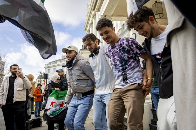 Syrian Foreign Minister Asaad al-Shaibani made his first official visit to the United Kingdom, marking the reopening of the Syrian Embassy in London after its closure in 2011. The visit included a flag-raising ceremony led by the foreign minister, symbolising the restoration of diplomatic presence and renewed ties between Syria and the UK., Credit:Zak Irfan / Avalon