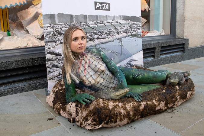 Bodypainted PETA 'Crocodile' in Filthy Pool to Condemn Hermès’ Skins Sales at New Bond Street, London, UK