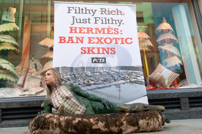 Bodypainted PETA 'Crocodile' in Filthy Pool to Condemn Hermès’ Skins Sales at New Bond Street, London, UK