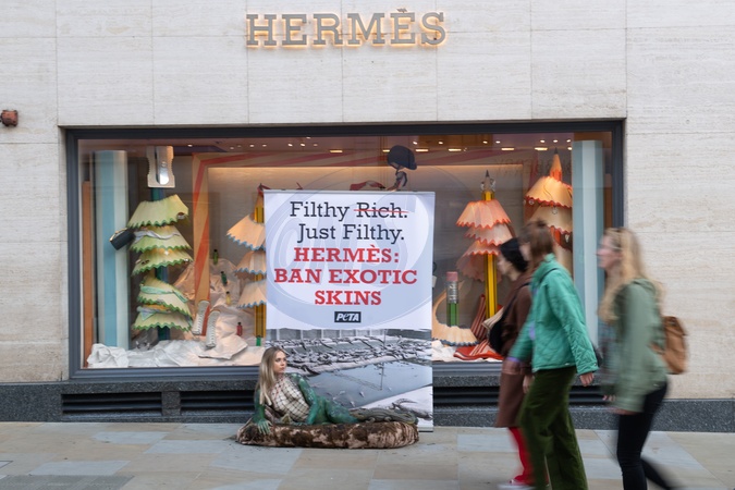 Animal rights activists PETA stage a bodypainted PETA 'Crocodile' in a filthy pool in protest against luxury fashion retailer Hermes for using animal skins in New Bond Street, London, England, UK on Thursday 13 November, 2025., Credit:Justin Ng / Avalon