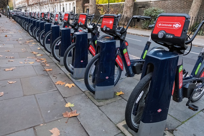 Electric hire bicycles lined up in Montague street close to the British museum. West end of London near Covent Garden area. England.