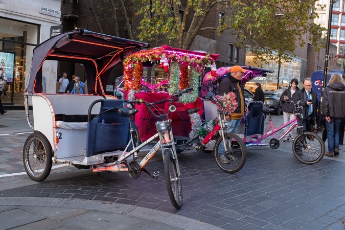 Rickshaw tricycles parked by Covent Garden tube station. West end of London near Covent Garden area. England.