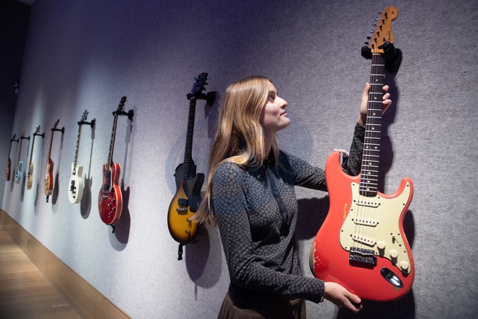 A staff member holds A 1960 Fender Stratocaster (est. £200k - £300k) and owned by Gary Moore as part of Bonhams The Gary Moore Collection: The Final Encore Sale which is to go on Auction on 20 November 2025 - Bonhams, London, England, UK on Thursday 13 November, 2025., Credit:Justin Ng / Avalon