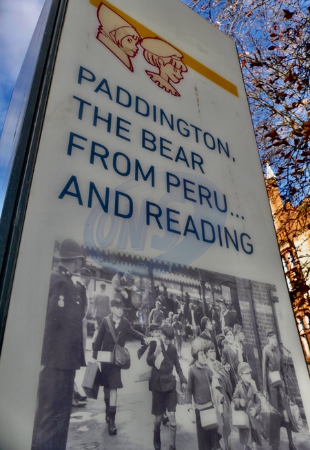 An information boar about the link between Paddington Bear & Reading. As a boy during WWII, Michael Bond remembered seeing many child evacuees arriving at Reading Station with all their possessions in a little suitcase and a label round their necks with their address on, which inspired his depiction of Paddington Bear as a refugee., Credit:Geoffrey Swaine / Avalon