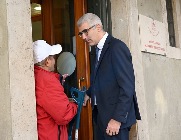 Colonnade in St. Peter's Square. Jubilee of the Poor. The Mother of Mercy Clinic, a facility of the Dicastery for the Service of Charity, offers free healthcare to those living in poverty, marginalization, or difficult situations. Pictured is Massimo Ralli, director of the health center, speaking with a patient. Vatican city, Italy 13 November 2025, Credit:Maria Laura Antonelli / Avalon