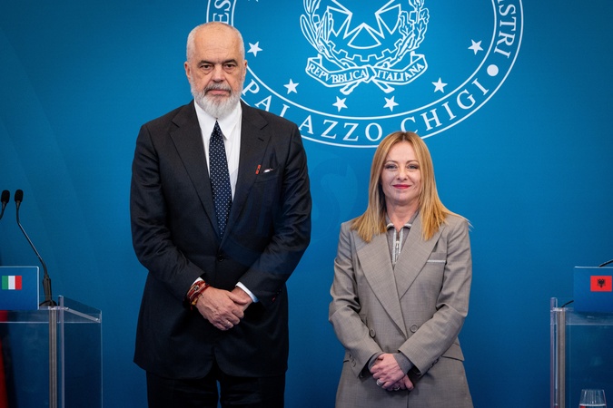 Italian Prime Minister Giorgia Meloni and Albanian Prime Minister Edi Rama address a press conference after the 1st Italy-Albania Intergovernmental Summit at Villa Doria Pamphilj in Rome, Italy, on 13 November 2025.