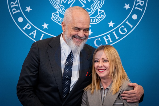 Italian Prime Minister Giorgia Meloni and Albanian Prime Minister Edi Rama address a press conference after the 1st Italy-Albania Intergovernmental Summit at Villa Doria Pamphilj in Rome, Italy, on 13 November 2025.
