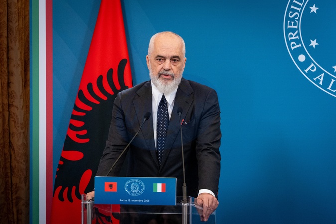 Italian Prime Minister Giorgia Meloni and Albanian Prime Minister Edi Rama address a press conference after the 1st Italy-Albania Intergovernmental Summit at Villa Doria Pamphilj in Rome, Italy, on 13 November 2025.