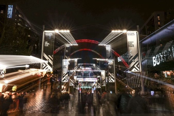 Fans make their way up Olympic Way as the Wembley Arch is lit on White and Red for England during the FIFA World Cup Qualifiers round 9 match England vs Serbia at Wembley Stadium, London, United Kingdom, 13th November 2025, Credit:Ae Cosgrove/News Images / Avalon