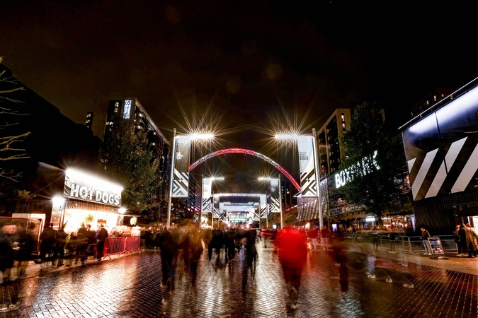 Fans make their way up Olympic Way as the Wembley Arch is lit on White and Red for England during the FIFA World Cup Qualifiers round 9 match England vs Serbia at Wembley Stadium, London, United Kingdom, 13th November 2025, Credit:Ae Cosgrove/News Images / Avalon
