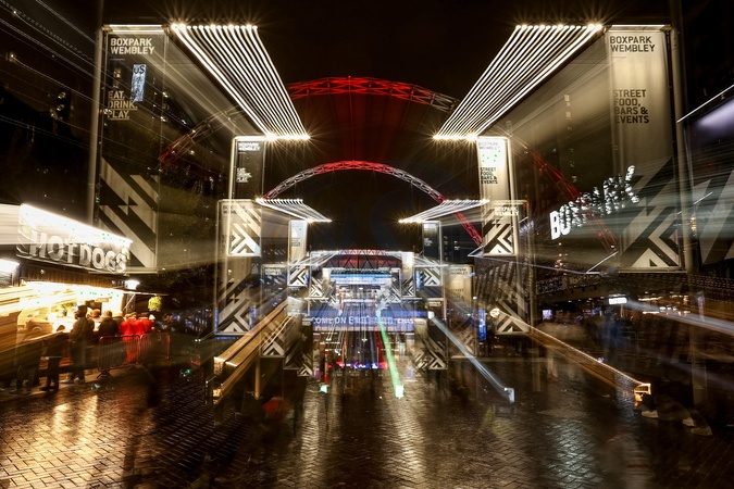 Fans make their way up Olympic Way as the Wembley Arch is lit on White and Red for England during the FIFA World Cup Qualifiers round 9 match England vs Serbia at Wembley Stadium, London, United Kingdom, 13th November 2025, Credit:Ae Cosgrove/News Images / Avalon