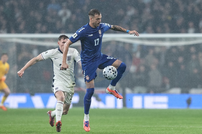 Ivan Ilic of Serbia controls the ball during the FIFA World Cup Qualifiers round 9 match England vs Serbia at Wembley Stadium, London, United Kingdom, 13th November 2025, Credit:Ae Cosgrove/News Images / Avalon