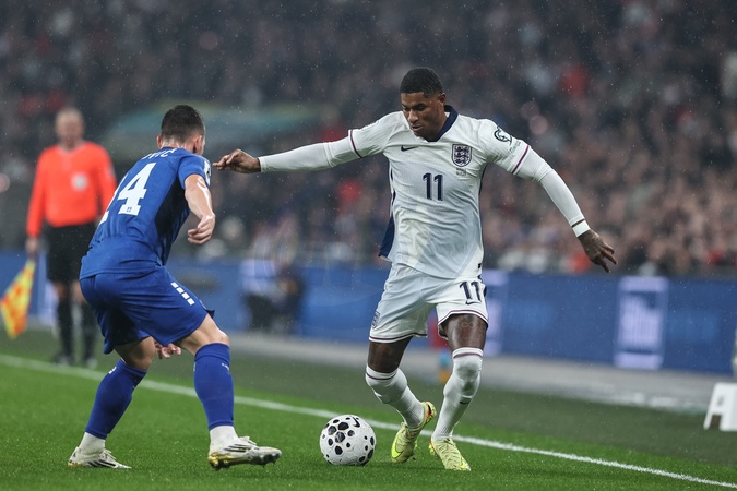 Marcus Rashford of England holds the ball as Andrija Zivkovic of Serbia pressures during the FIFA World Cup Qualifiers round 9 match England vs Serbia at Wembley Stadium, London, United Kingdom, 13th November 2025, Credit:Ae Cosgrove/News Images / Avalon