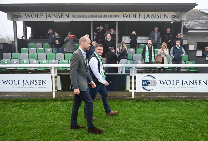 Prince William, Prince of Wales, Duke of Cornwall (centre left) walks in front of the stand during his visit to Mousehole AFC, where he opened a new access road to the club's ground and facilities on November 13, 2025 in Mousehole, England., Credit:Avalon.red / Avalon