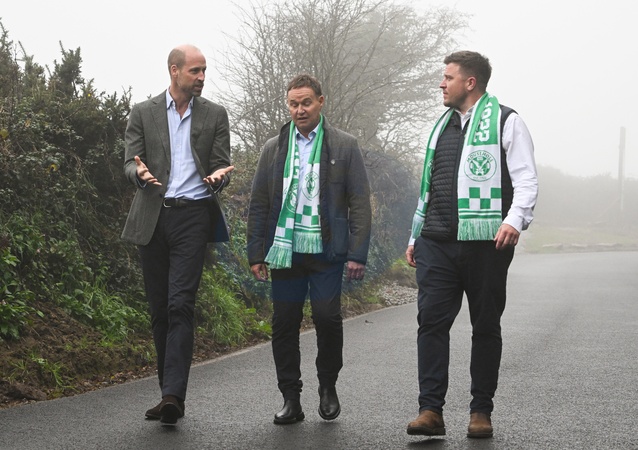 Prince William, Prince of Wales, Duke of Cornwall (L) speaks with members of the consortium who built the new road, during his visit to Mousehole AFC, where he opened a new access road to the club's ground and facilities on November 13, 2025 in Mousehole, England., Credit:Avalon.red / Avalon