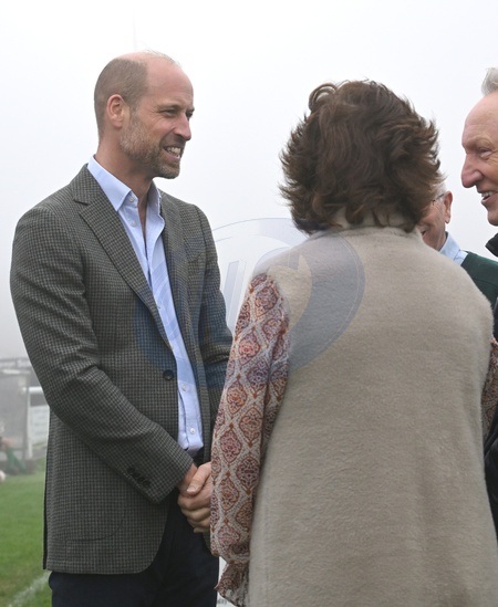 Prince William, Prince of Wales, Duke of Cornwall (L) speaks with Neil Warnock (R) and members of the community during his visit to Mousehole AFC, where he opened a new access road to the club's ground and facilities on November 13, 2025 in Mousehole, England., Credit:Avalon.red / Avalon